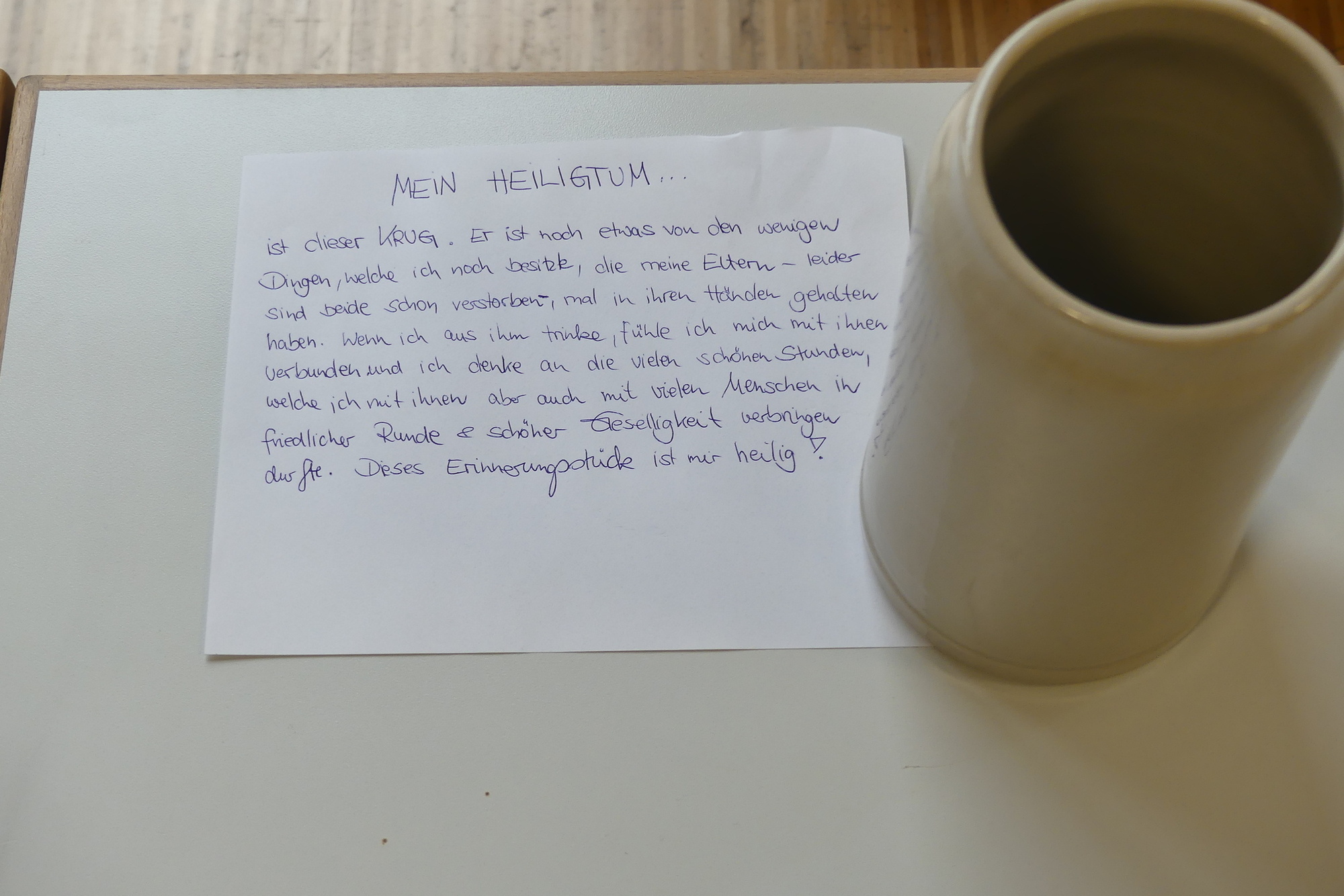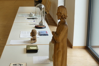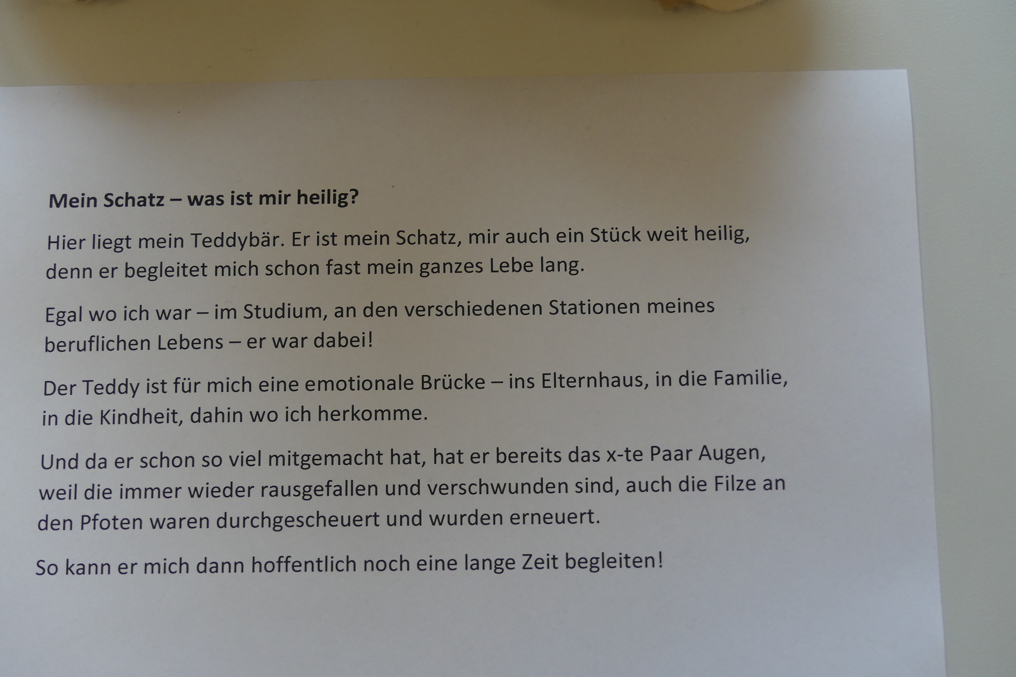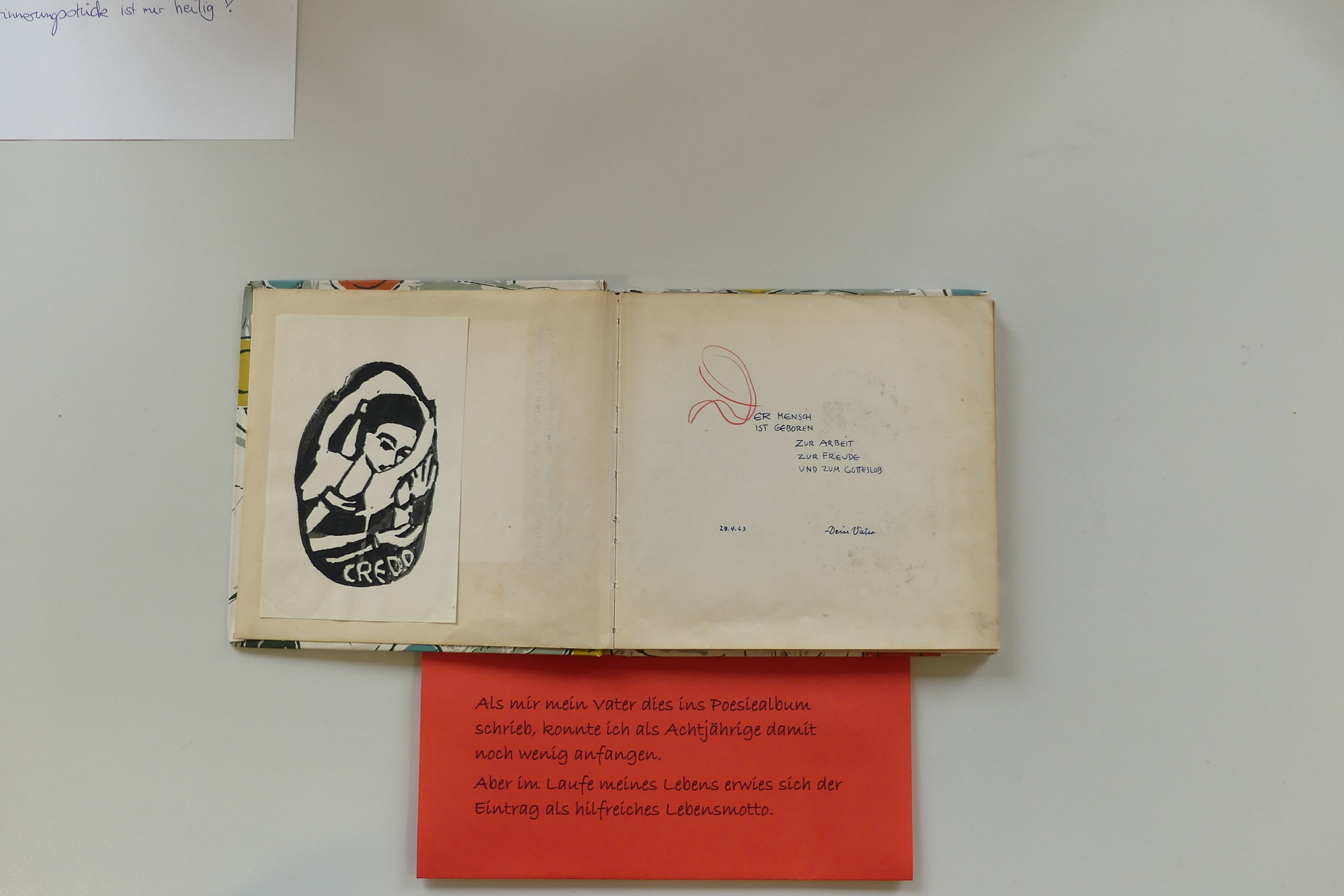 Bei der anschließenden Ausstellung im Pfarrer-Hersam-Haus konnten Alltagsgegenstände betrachtet werden, die durch verschiedene Lebensumstände zu kleinen Heiligtümern das Alltags werden können - so auch neben religiösen Gegenständen ein Mutterschaftspass, Omas Geschirr und ihre Schürze, ein Teddybär und ein Poesiealbum.