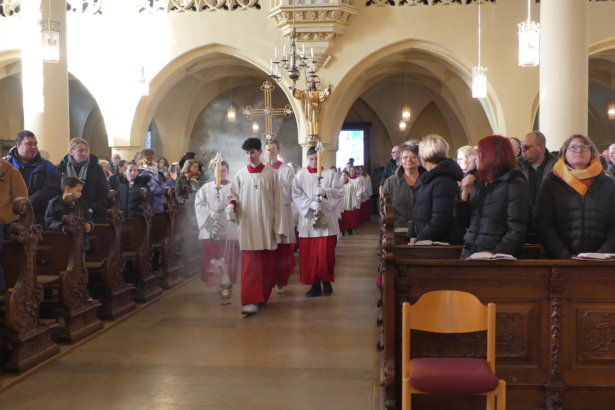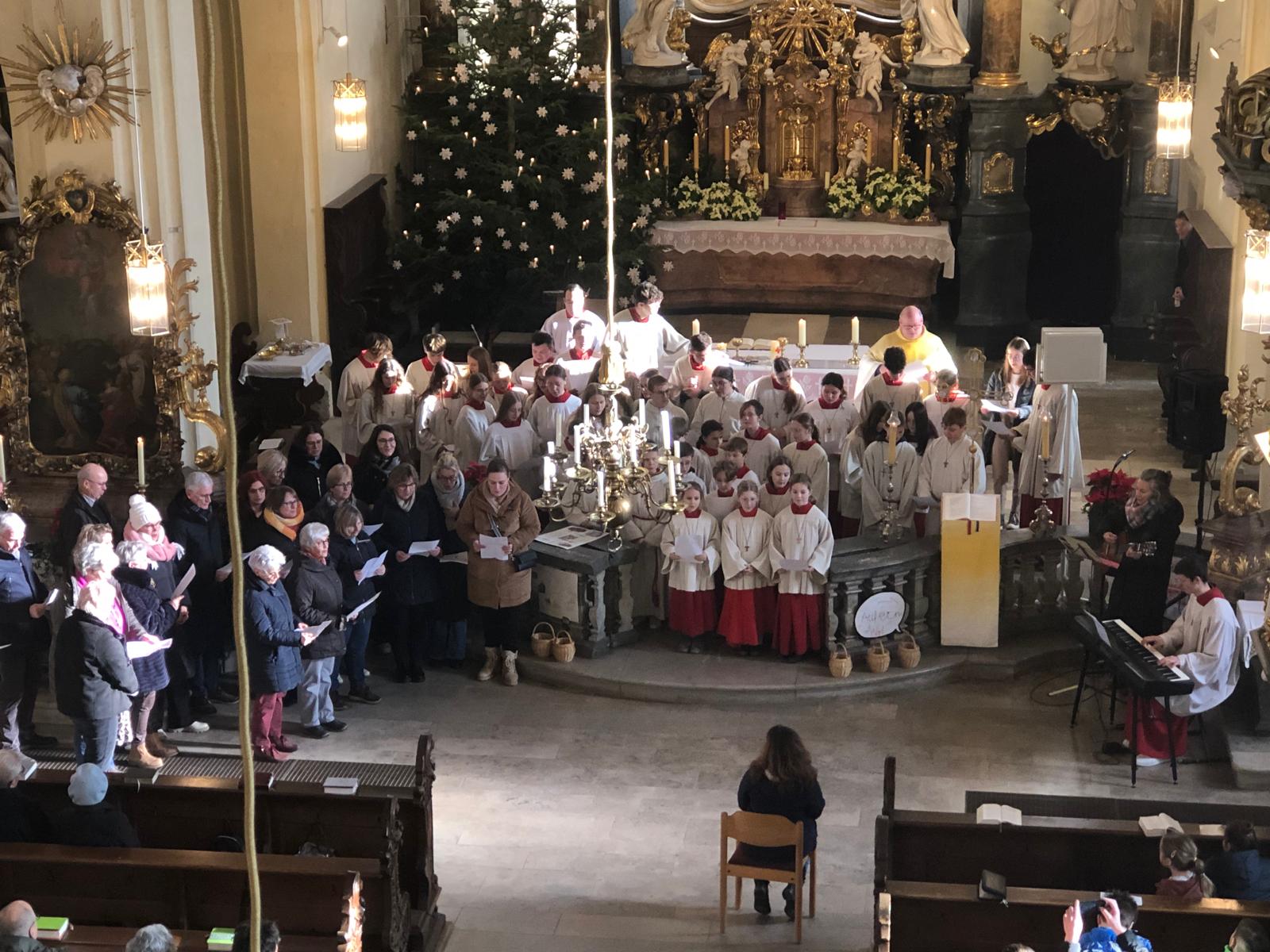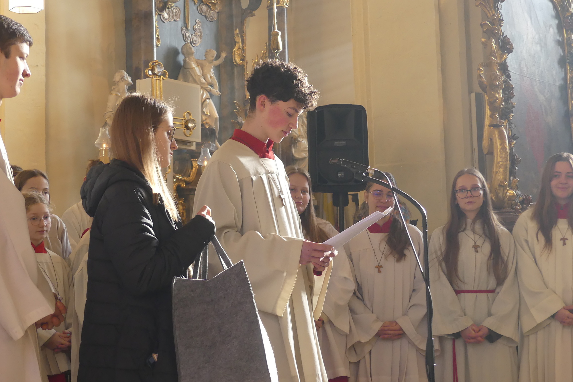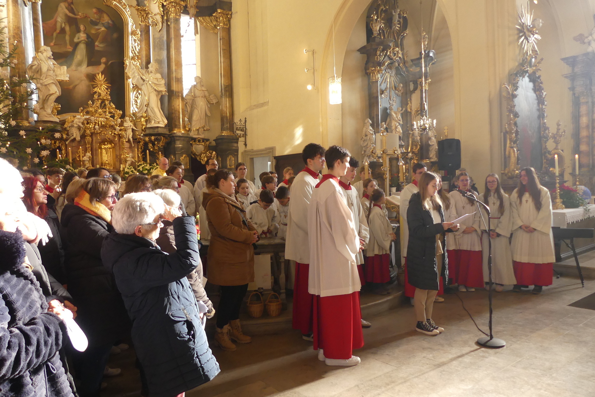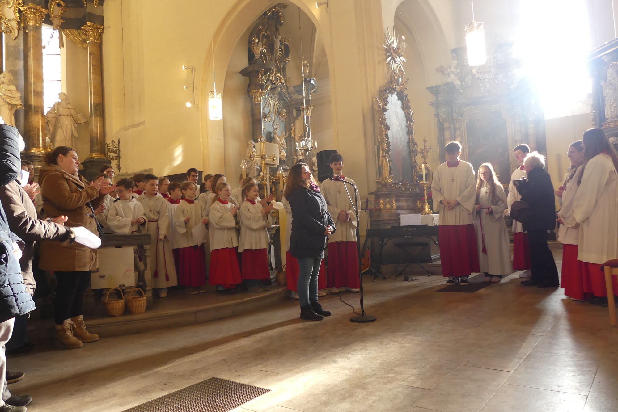 „Taufe des Herrn“ in Gerolzhofen: Über vierzig „Minis“ aus dem ganzen Pastoralen Raum ziehen feierlich ein. Die Wintersonne taucht das Gotteshaus in Verbindung mit dem verwendeten Weihrauch in eine mystische Atmosphäre. Wer an diesem Tag diesen Gottesdienst besucht, wird nicht unbewegt nach Hause gehen – denn es steht neben alledem eine Verabschiedung an: Pastoralreferentin Franziska Reichert geht in die Elternzeit und wird danach nicht mehr im Pastoralen Raum Gerolzhofen tätig sein.