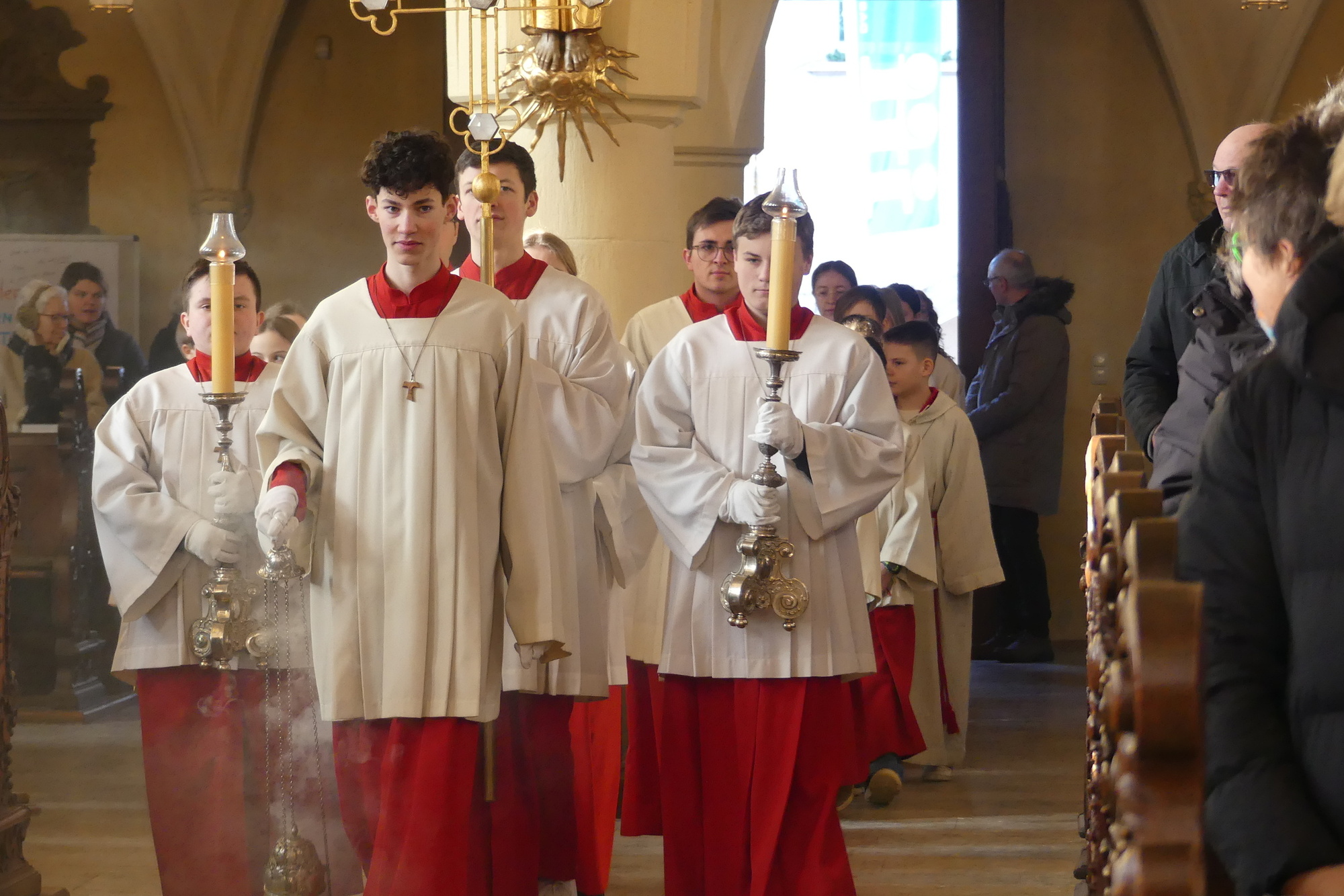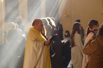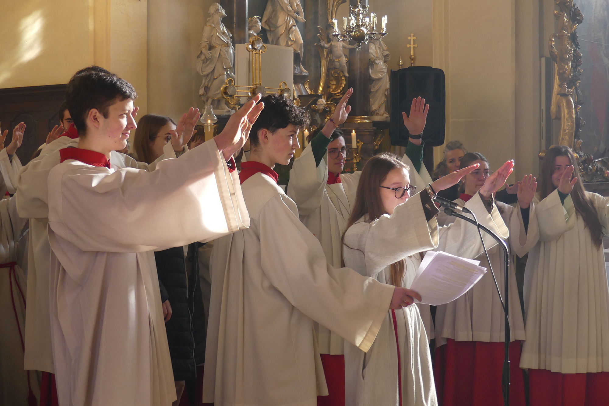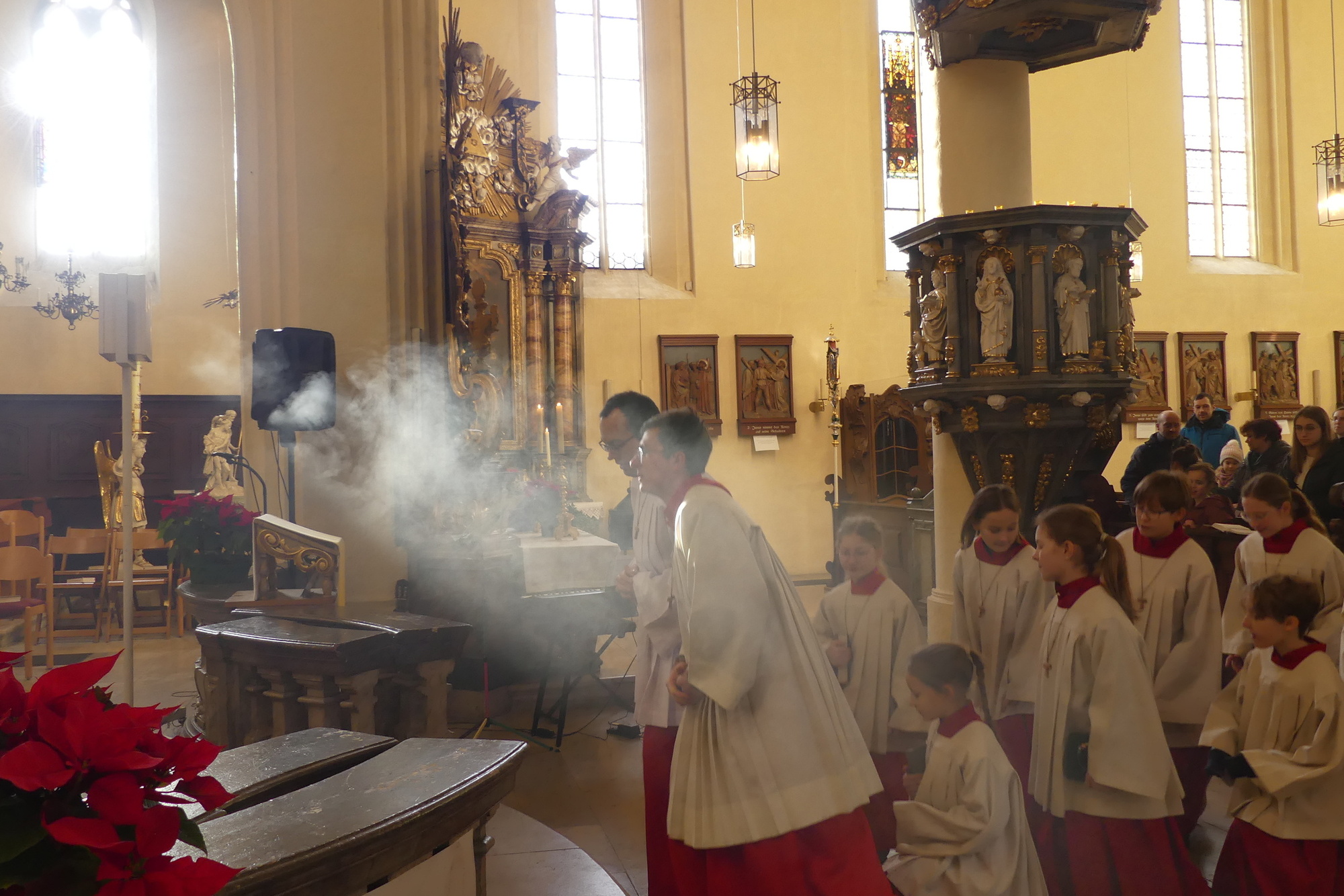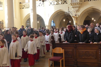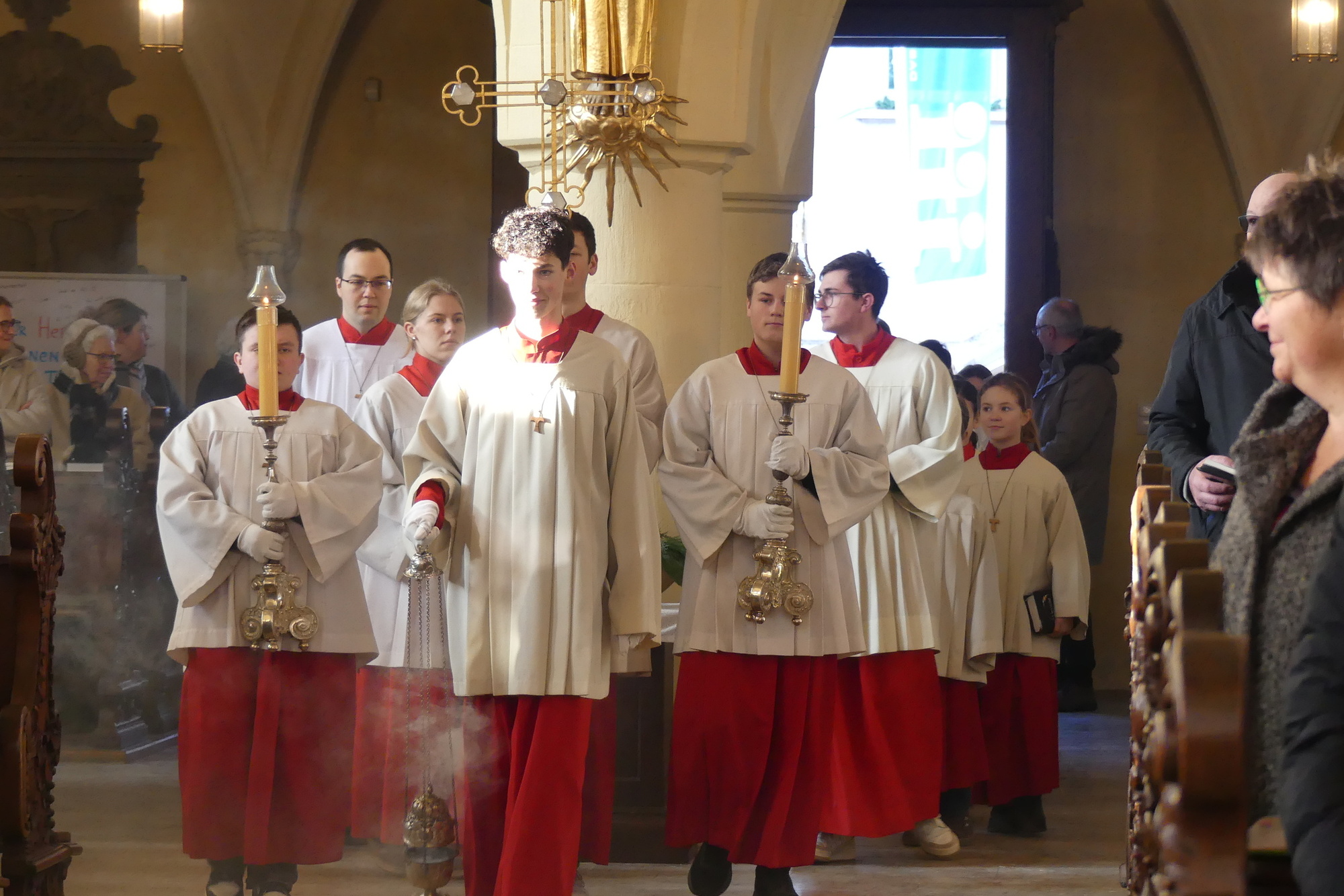 „Taufe des Herrn“ in Gerolzhofen: Über vierzig „Minis“ aus dem ganzen Pastoralen Raum ziehen feierlich ein. Die Wintersonne taucht das Gotteshaus in Verbindung mit dem verwendeten Weihrauch in eine mystische Atmosphäre. Wer an diesem Tag diesen Gottesdienst besucht, wird nicht unbewegt nach Hause gehen – denn es steht neben alledem eine Verabschiedung an: Pastoralreferentin Franziska Reichert geht in die Elternzeit und wird danach nicht mehr im Pastoralen Raum Gerolzhofen tätig sein.