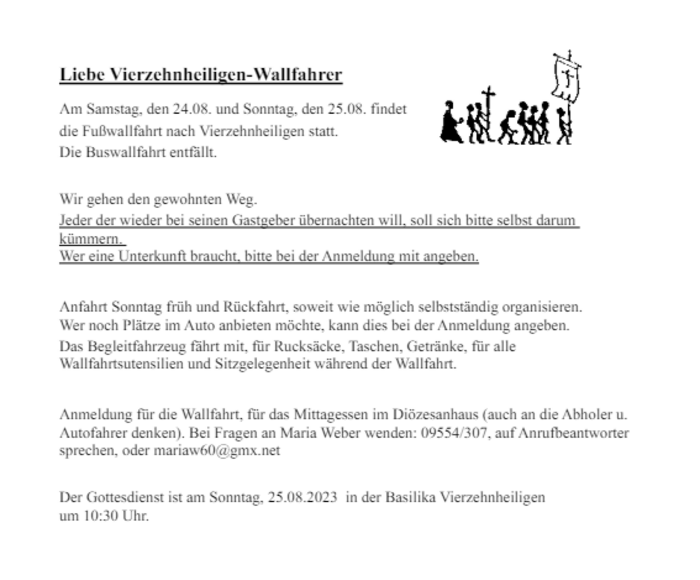 Wir gehen den gewohnten Weg. Jeder der wieder bei seinen Gastgeber übernachten will, soll sich bitte selbst darum kümmern. Wer eine Unterkunft braucht, bitte bei der Anmeldung mit angeben. Anfahrt Sonntag früh und Rückfahrt, soweit wie möglich selbstständig organisieren. Wer noch Plätze im Auto anbieten möchte, kann dies bei der Anmeldung angeben. Das Begleitfahrzeug fährt mit, für Rucksäcke, Taschen, Getränke, für alle Wallfahrtsutensilien und Sitzgelegenheit während der Wallfahrt. Anmeldung für die Wallfahrt, für das Mittagessen im Diözesanhaus (auch an die Abholer u. Autofahrer denken). Bei Fragen an Maria Weber wenden: 09554/307, auf Anrufbeantworter sprechen, oder mariaw60@gmx.net